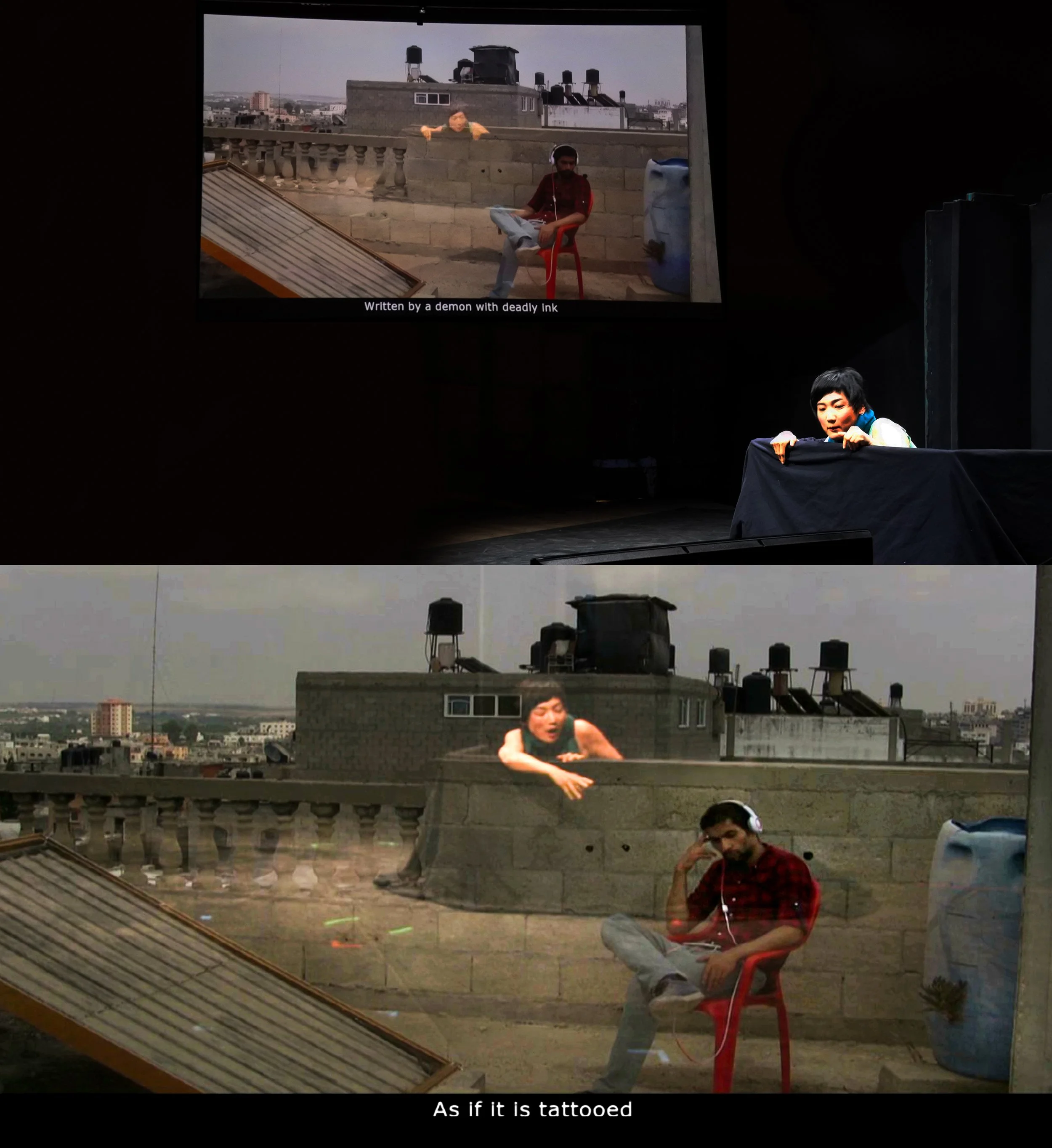 By using a mix of live-streaming and recorded video, a single performance space was created where the performers worked together. Occupying each other’s homes and streets, and daily concerns like marriage, protest, the joys of the Surrey hills, a rooftop in Gaza City, children, the cinema, a forbidden pas de deux, the benefits of a massacre, how to be safe, they became ghostly protagonists in each other’s drama.