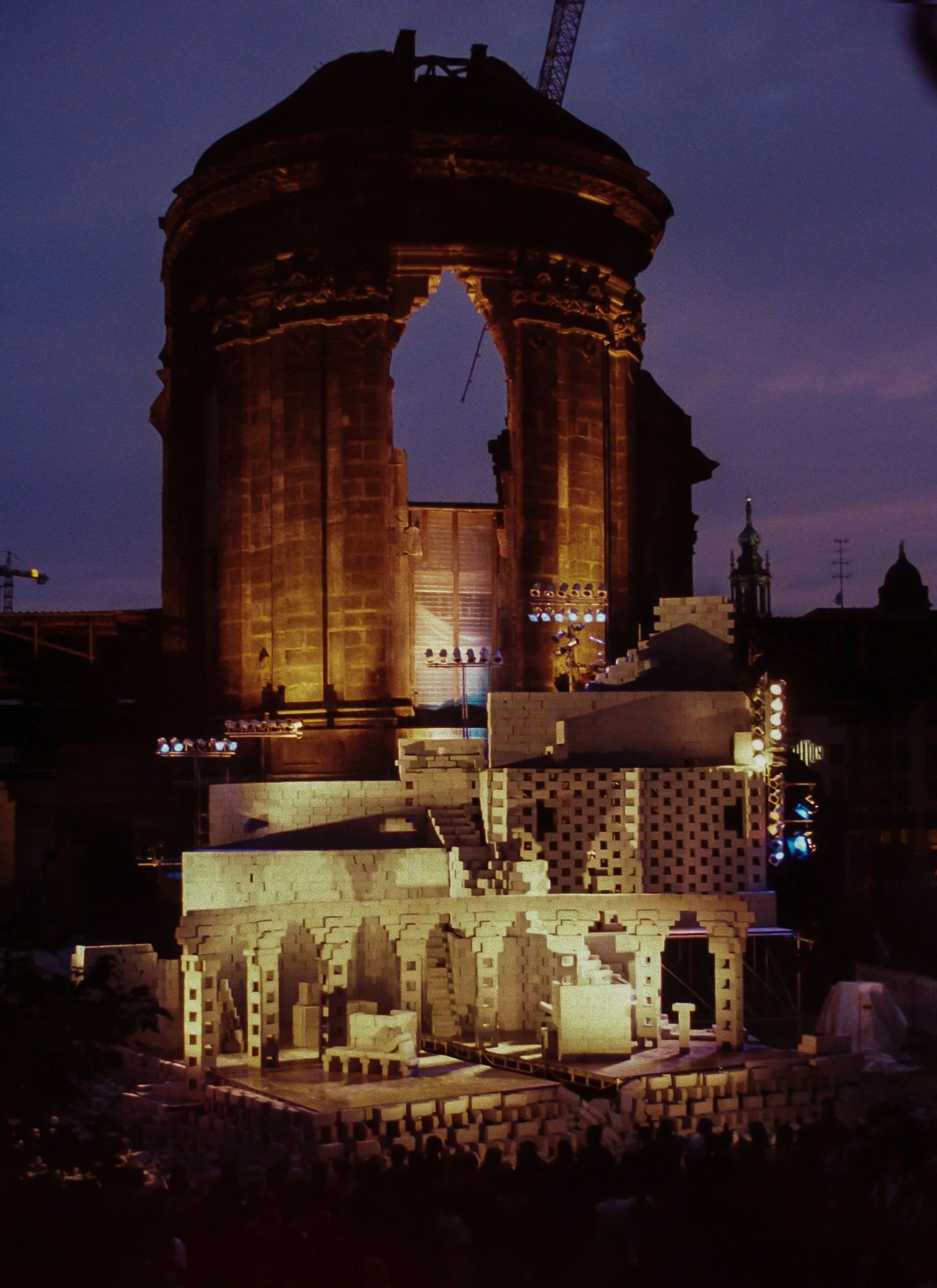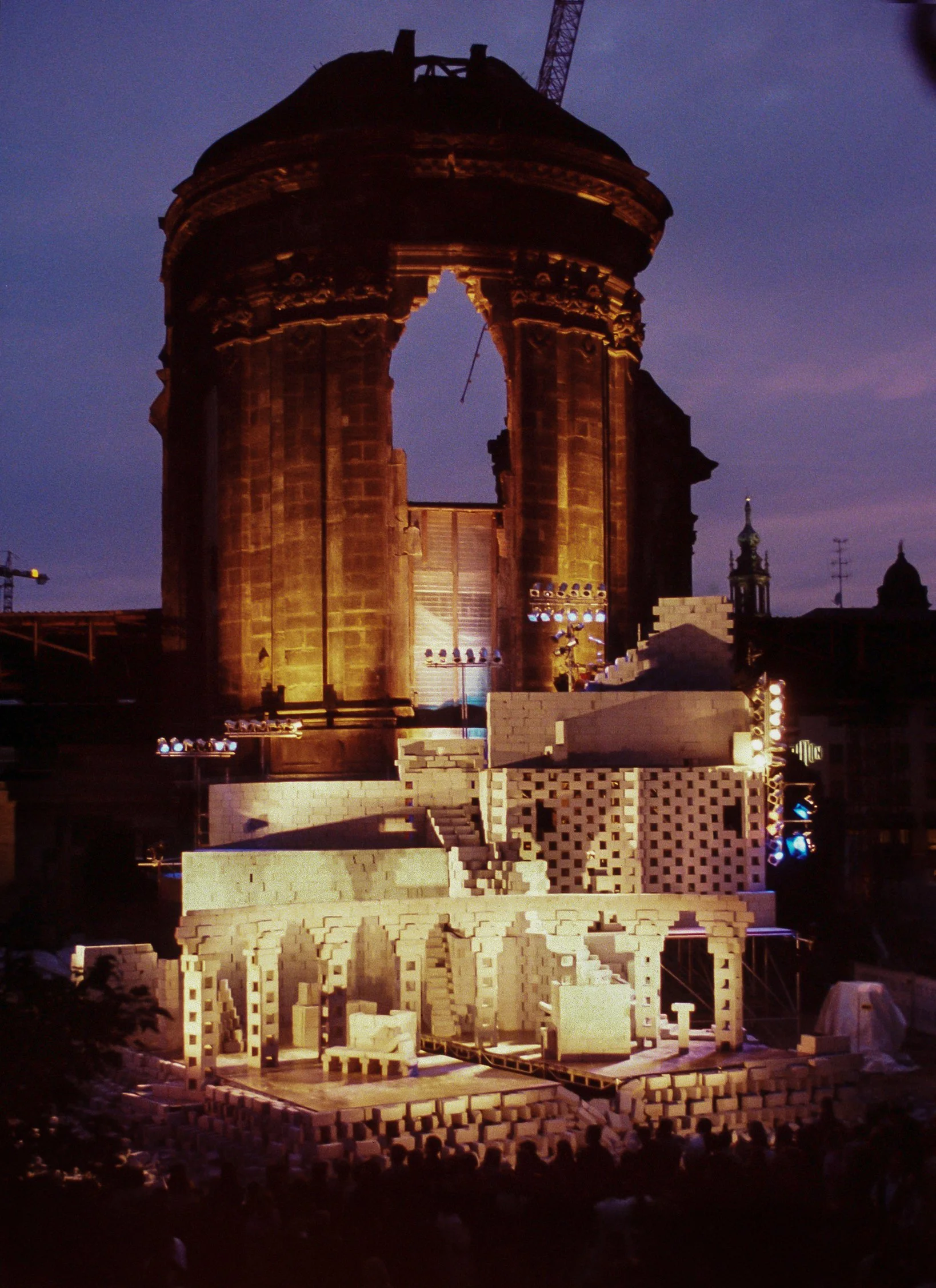 The Theater der Welt invited Station House Opera to create a monumental concrete block project beside Dresden's famous Frauenkirche which had been destroyed by the British during the war and was in the process of being rebuilt. The title is how Kurt Schwitters deconstructed and rebuilt Dresden's name in his sound sonata 'Ursonate'.