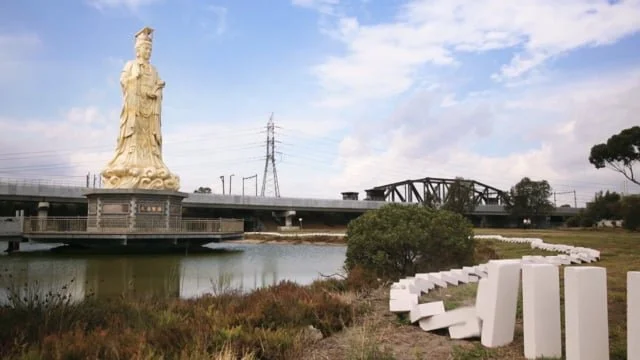 Starting in a container park, the dominoes cross the Maribyrnong river, through a Chinese temple, a beach, seaside café, apartment tower, wealthy mansions, shops and bars, an inner-city estate, a Thai restaurant and a homeless person’s kitchen, before falling from Melbourne town hall window, on their way through the business district to the Melbourne Arts Centre.
