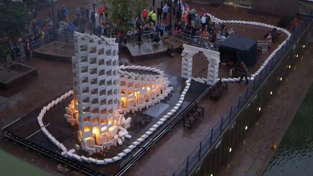 Dominoes takes as its starting point the simplest of ideas… a line of dominoes. Thousands of breezeblocks are used to create a moving sculpture which runs across the city, unfolding over the course of the day.