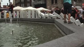 From a ship moored in the harbour, the line through bars cinemas theatres shops and churches, crossing busy multiple tramlines and roads, the dominoes wind through central Rotterdam, finishing outside the Schouwburg by climbing a giant staircase.