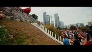 Dominoes was produced by to address the divisions in the city caused by the Gardner Expressway cutting across the urban fabric of local neighbourhoods. Starting at the Wellington destructor in the north, the route passed through residential, public and commercial spaces, closing roads, visiting a restaurant, domestic houses, a gallery, and container retail park on its way to Bathurst Bridge. It fell into waste ground, climbed back up to the library, entered Canoe Landing Park, falling off the canoe and negotiating a large block structure under the expressway. Going through Loblaw’s department store and crossing a nine-lane junction on Lake Shore Boulevard, it visited the Arcadia Housing Co-operative and the Waterfront Neighbourhood Centre before climbing a staircase on a floating dock and falling into Lake Ontario.