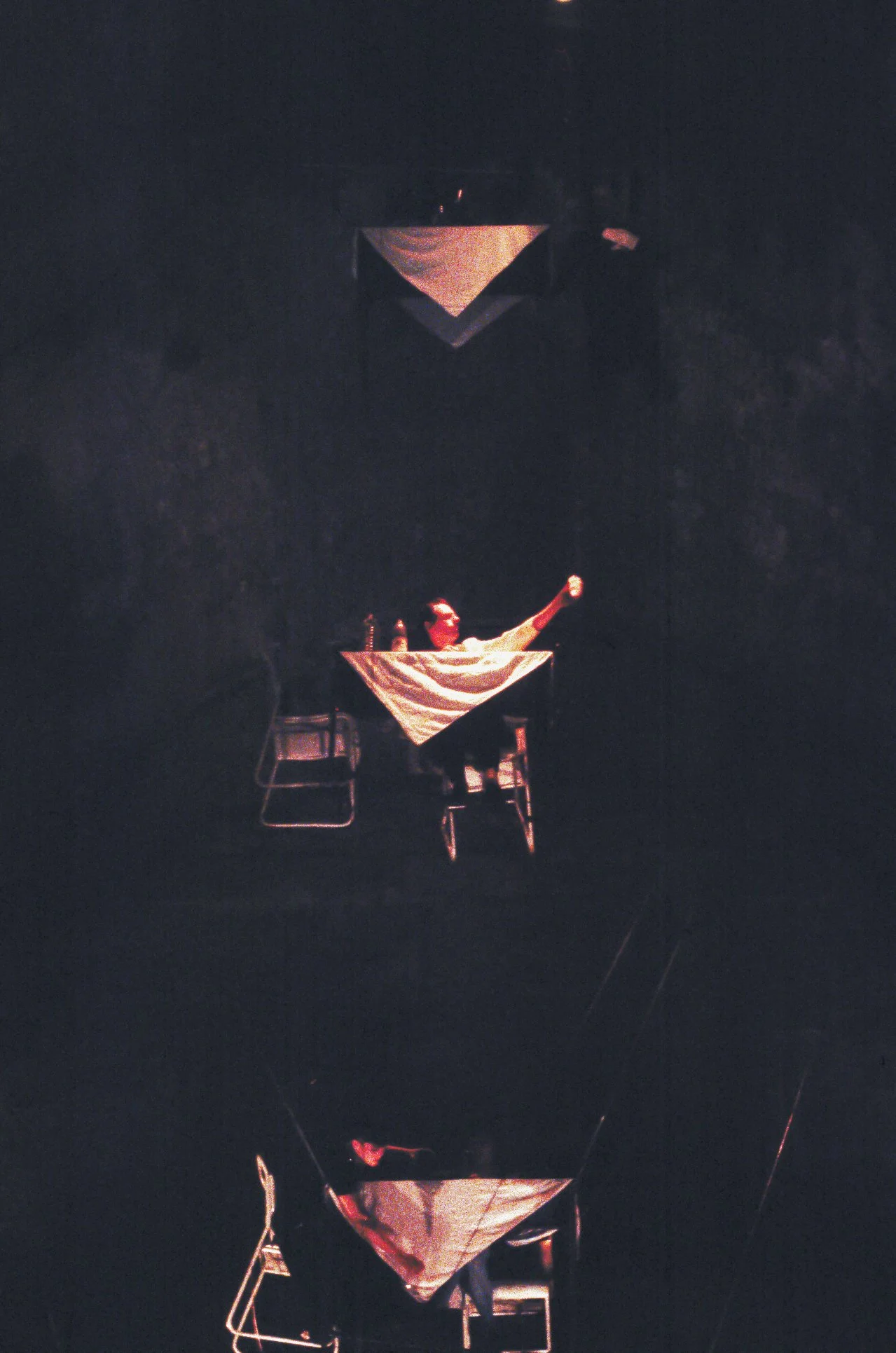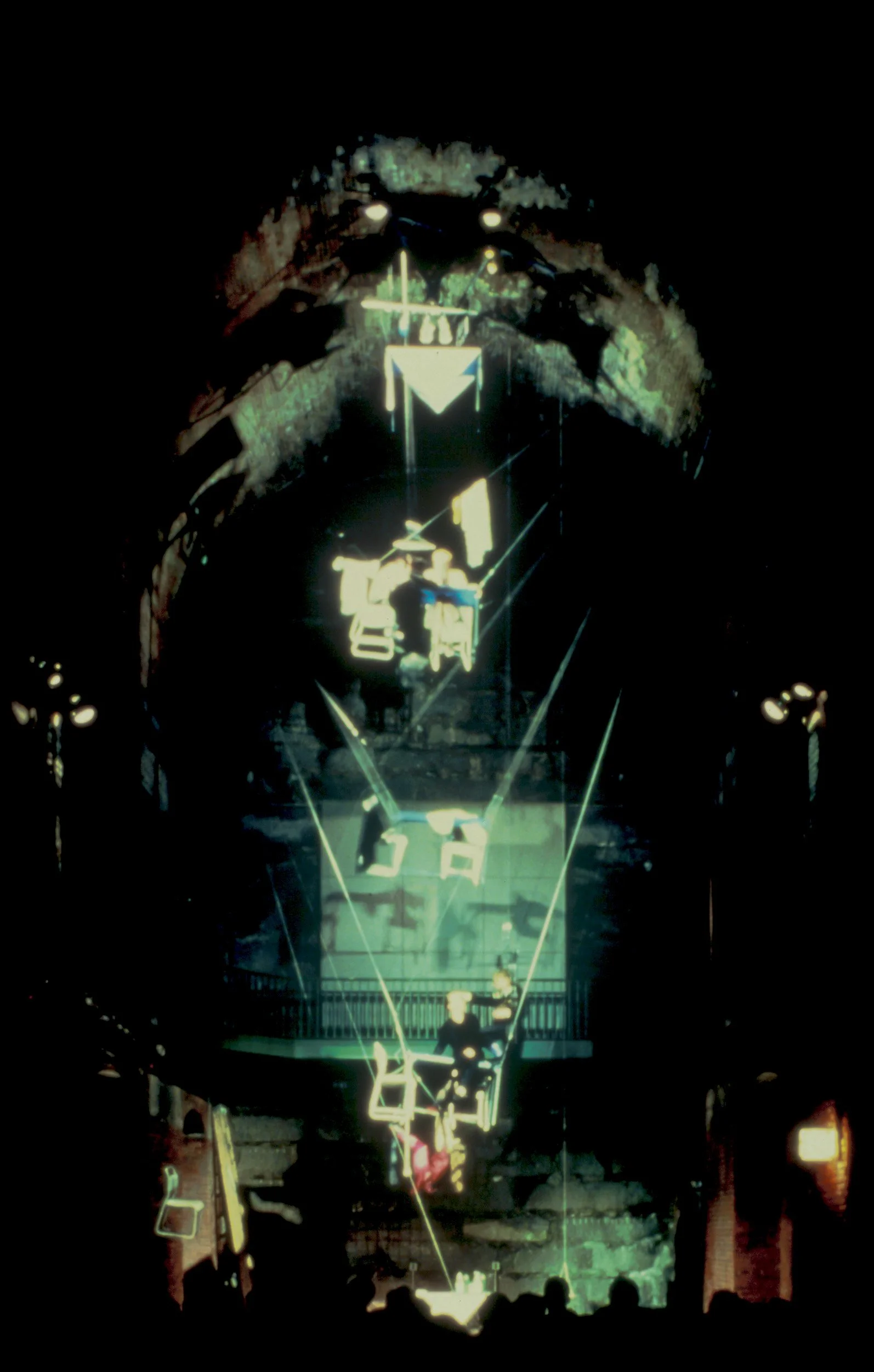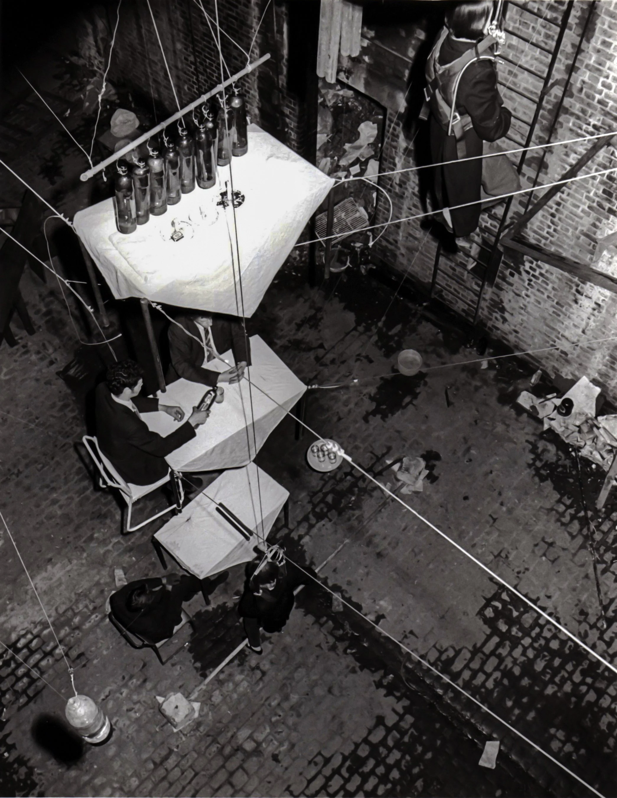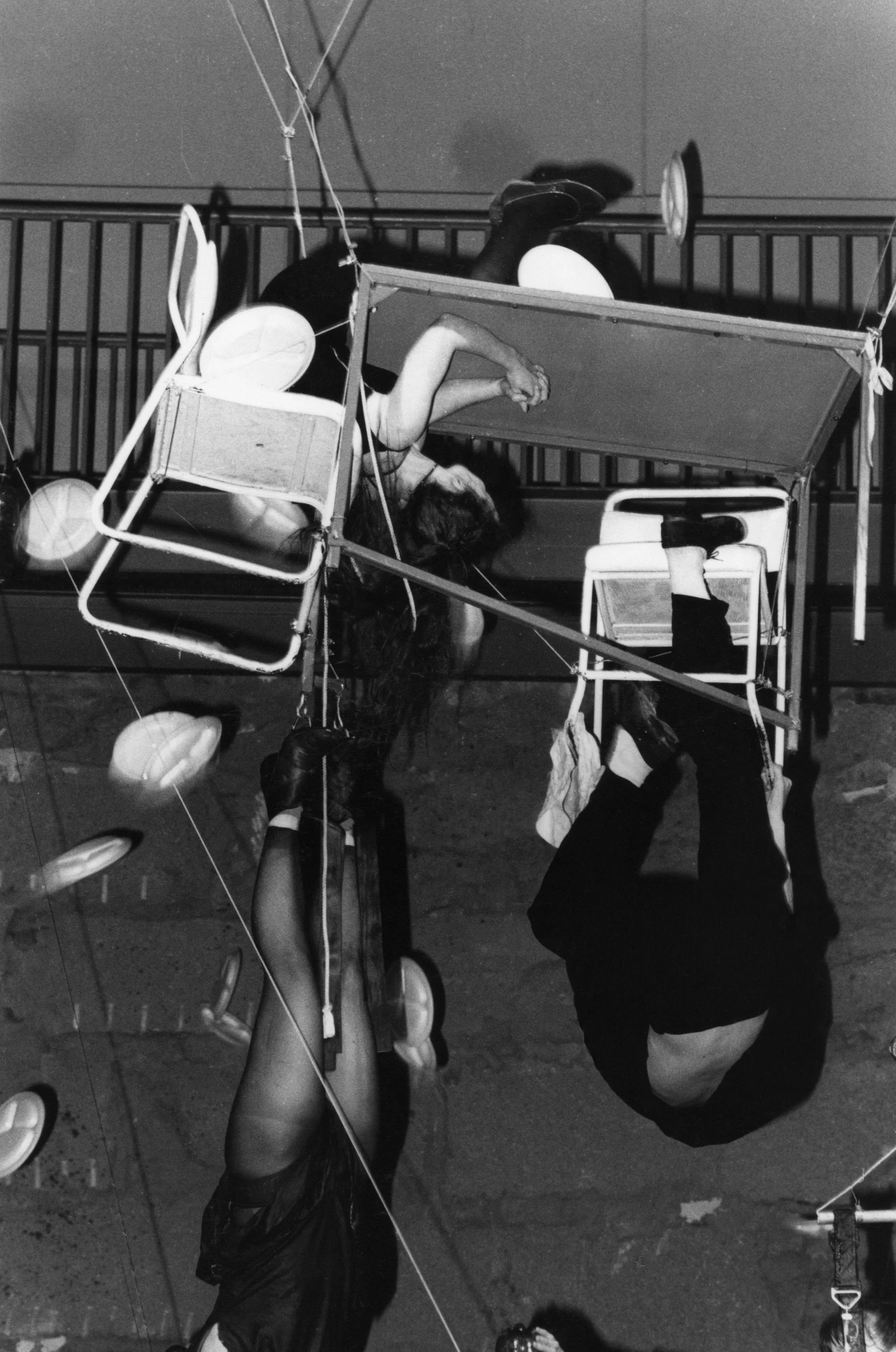 Drunken Madness presented the audience with the spectacle of tables and chairs suspended by wires, one above the other. Performers were seated at the tables, two others were in harnesses and counterweighted against each other: as one rose the other fell. So long as those seated remained still, the column remained stable, but as soon as one moved, the shifting weight tipped the table over, threw it out of line. This was a self-contained world hanging within another, more randomly composed one: a dirty abattoir, a bridge anchorage. At rest it was an immensely simple apparatus, obvious and incomprehensible; in motion it could be terrifying, producing real dangers for its inhabitants. As part of its functioning, bottles of drink were distributed and consumed, the ensuing drunkenness throwing the balanced mechanism into chaos.