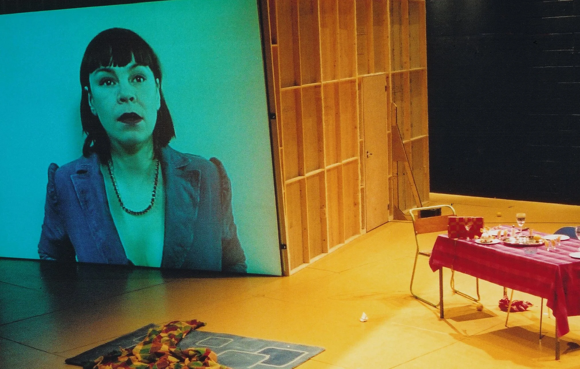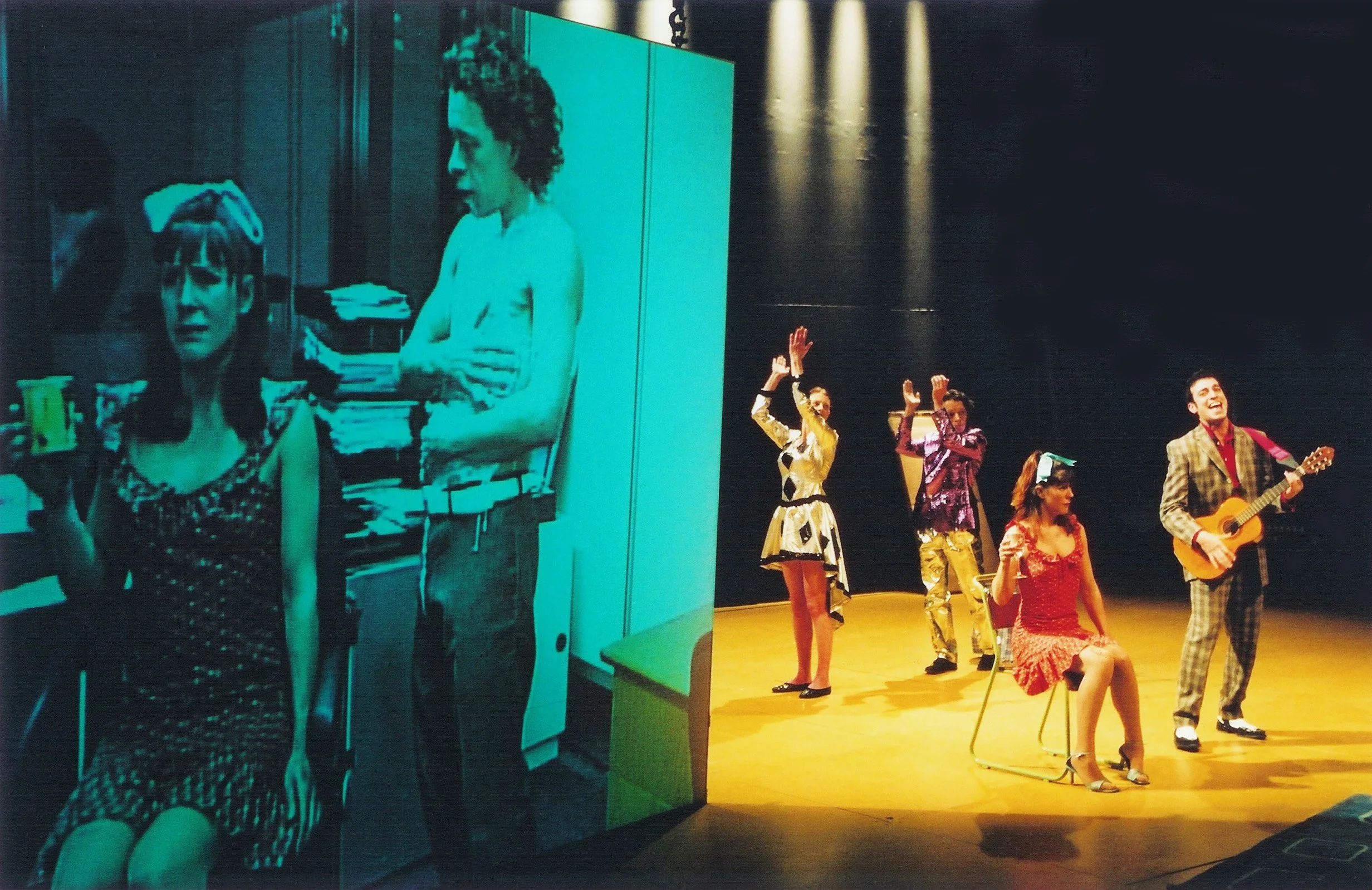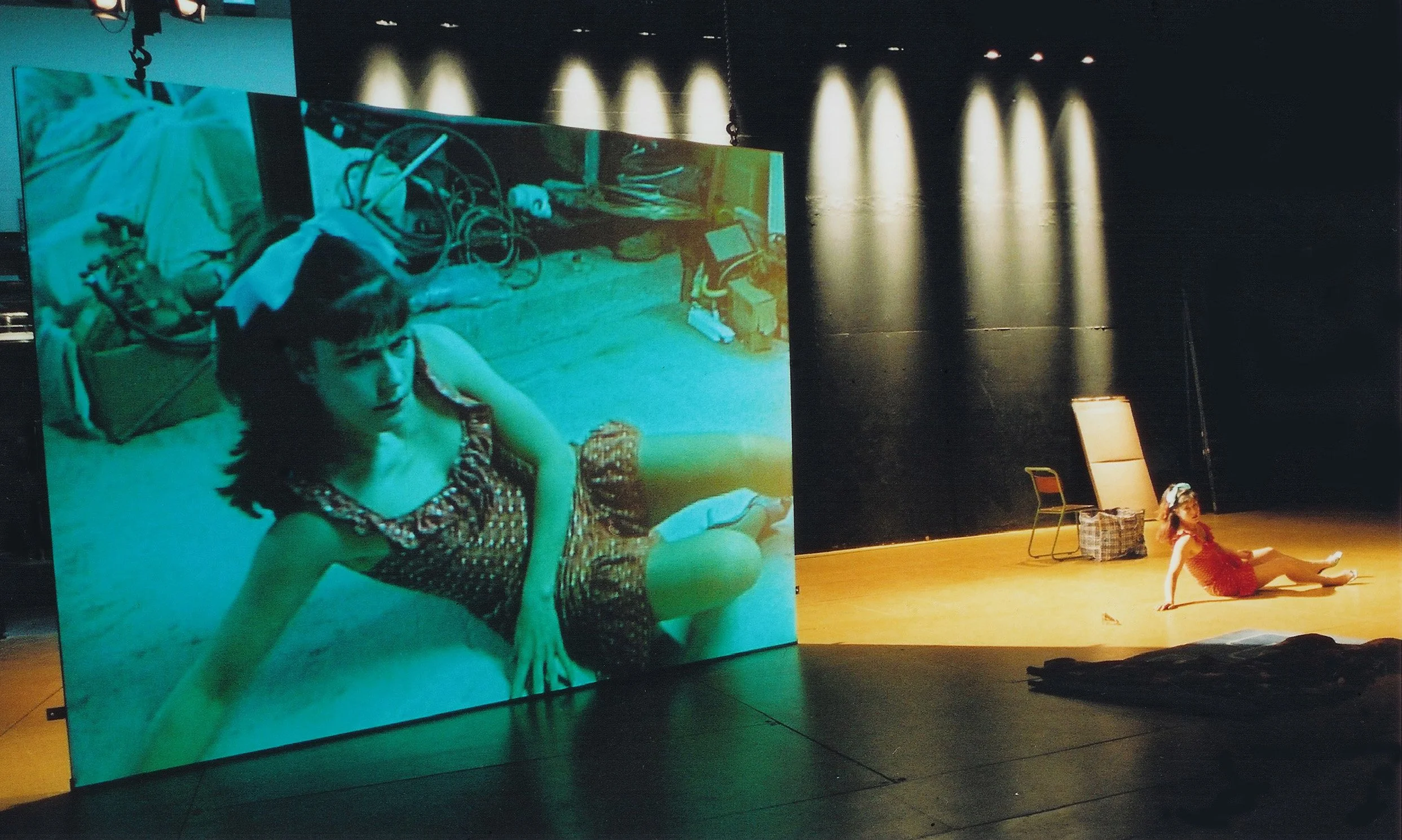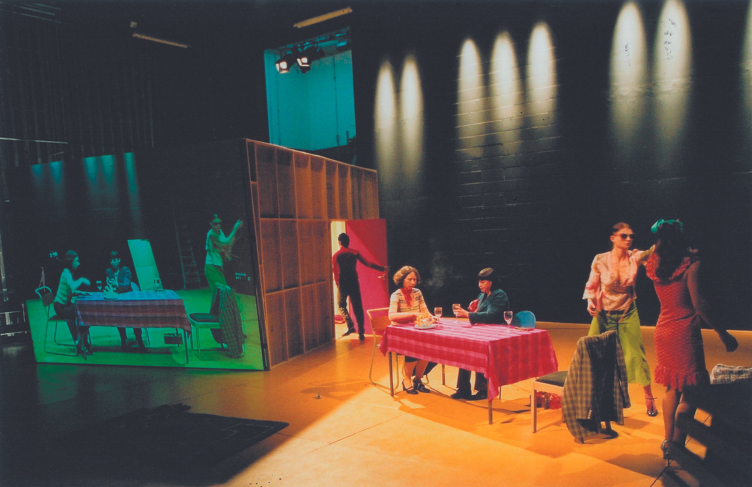 Audiences were led around the newly built Hampstead Theatre via an audio tour, before emerging from the scene dock to be confronted by a giant mirror facing them on the stage. From the auditorium, a live video projection is seen on the back of the mirror – this covers exactly the view that the mirror obscures so as people appear and disappear behind the screen they change from tangible to virtual without disruption. Into this live illusion is cut recorded video – of imaginary events behind the screen, or views of action in the backstage theatre spaces that the audience has just walked through, and so mixing the stage present with a choreographed past.atre spaces that the audience has just walked through, and so mixing the stage present with a choreographed past.