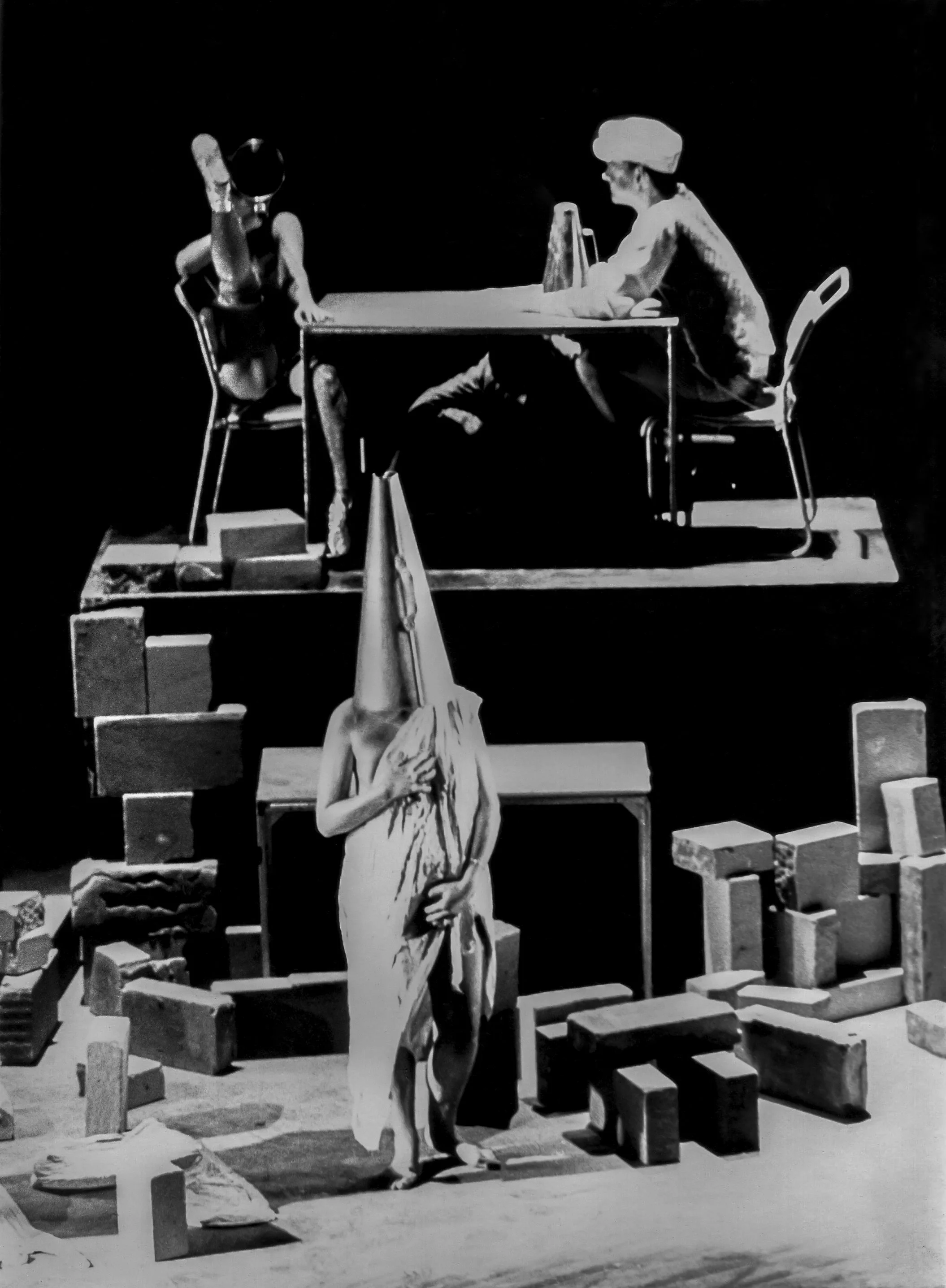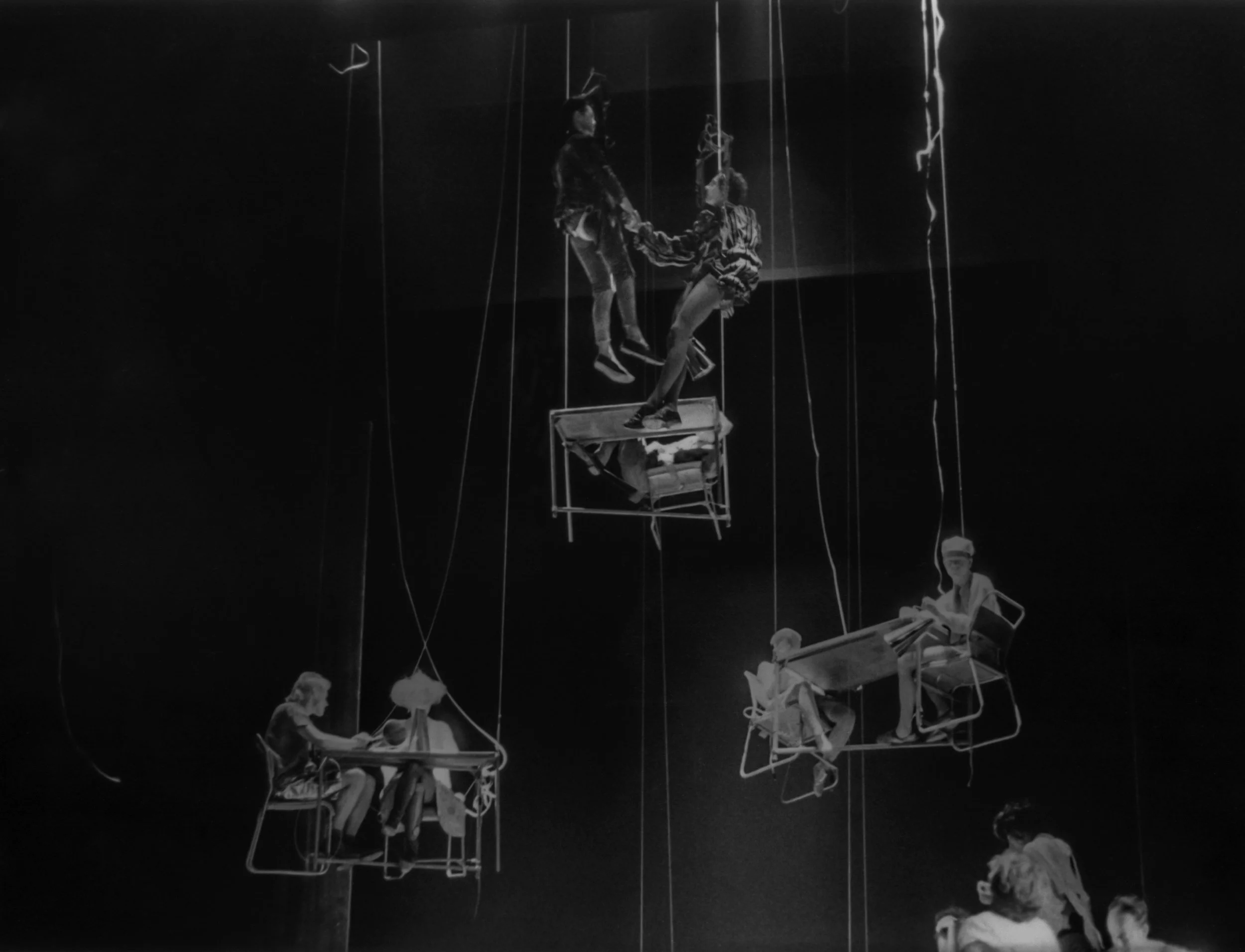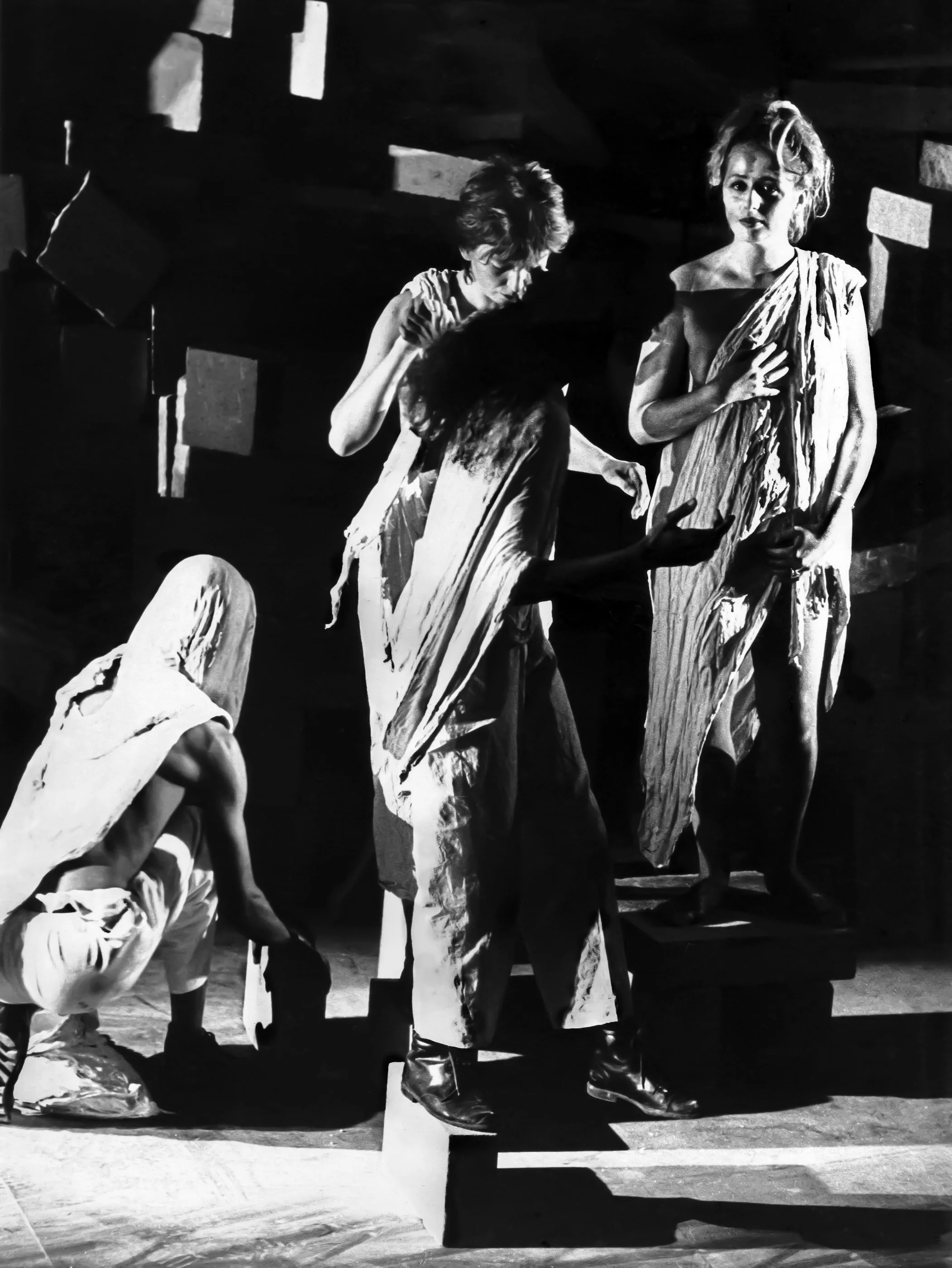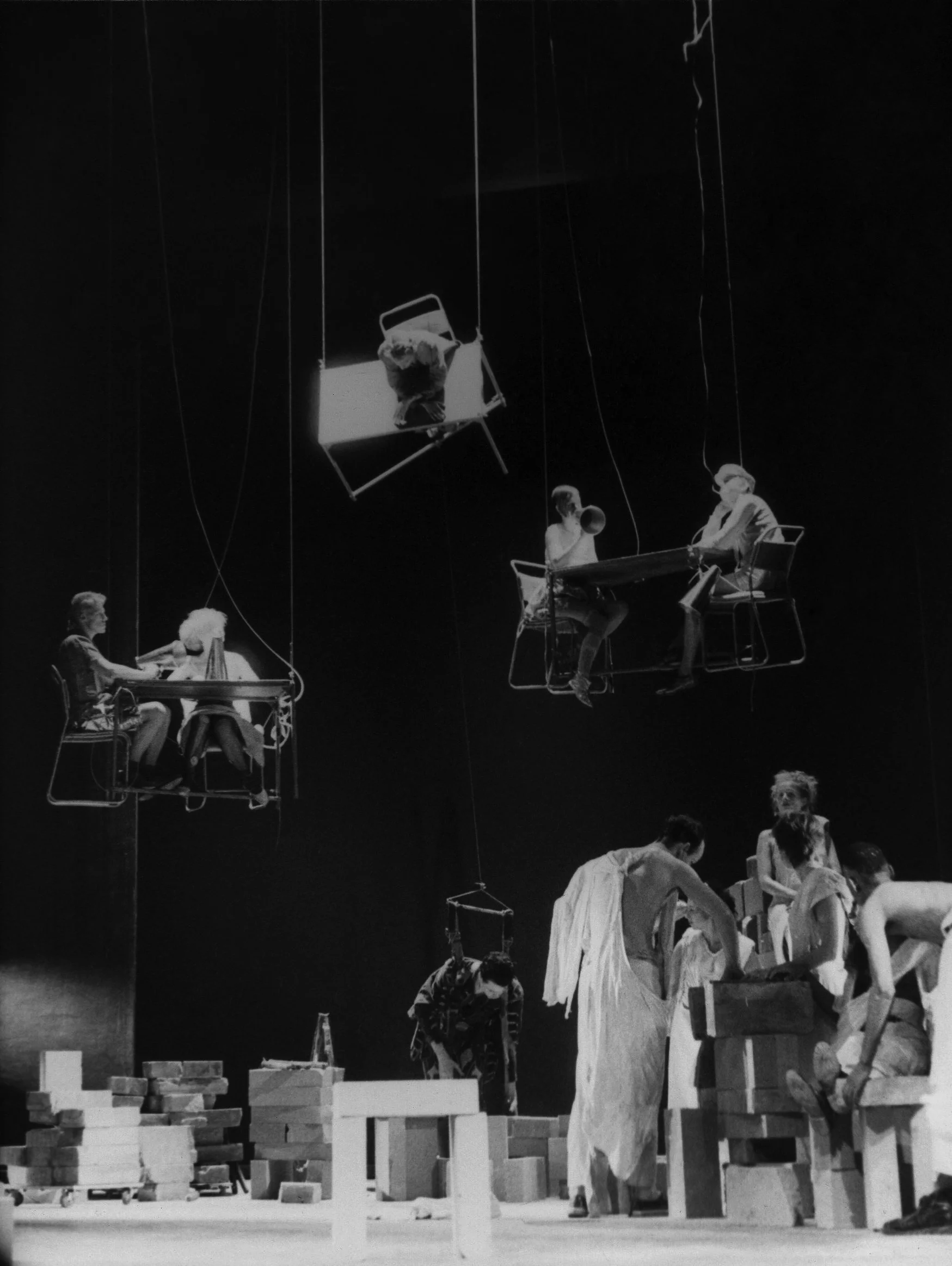 A city of ground dwellers used loose stacks of concrete blocks as their clothing, moving them slowly and laboriously across the stage, changing their shape. Above them, an invasion of airborne performers ascended and descended, calling out inconsequential messages of love from popular songs through golden trumpets.