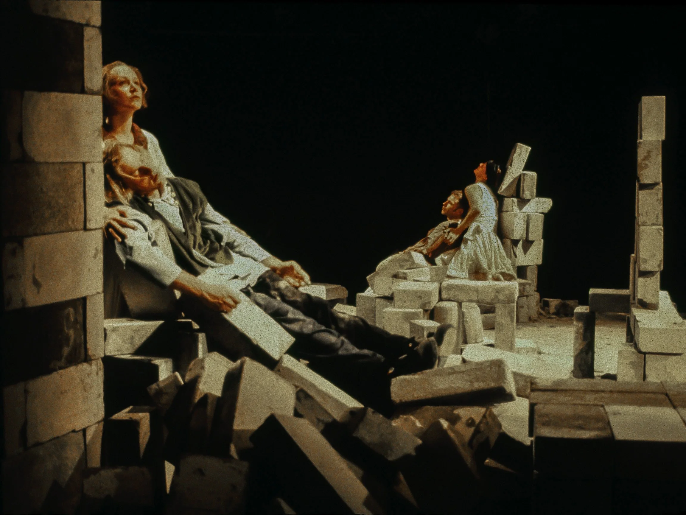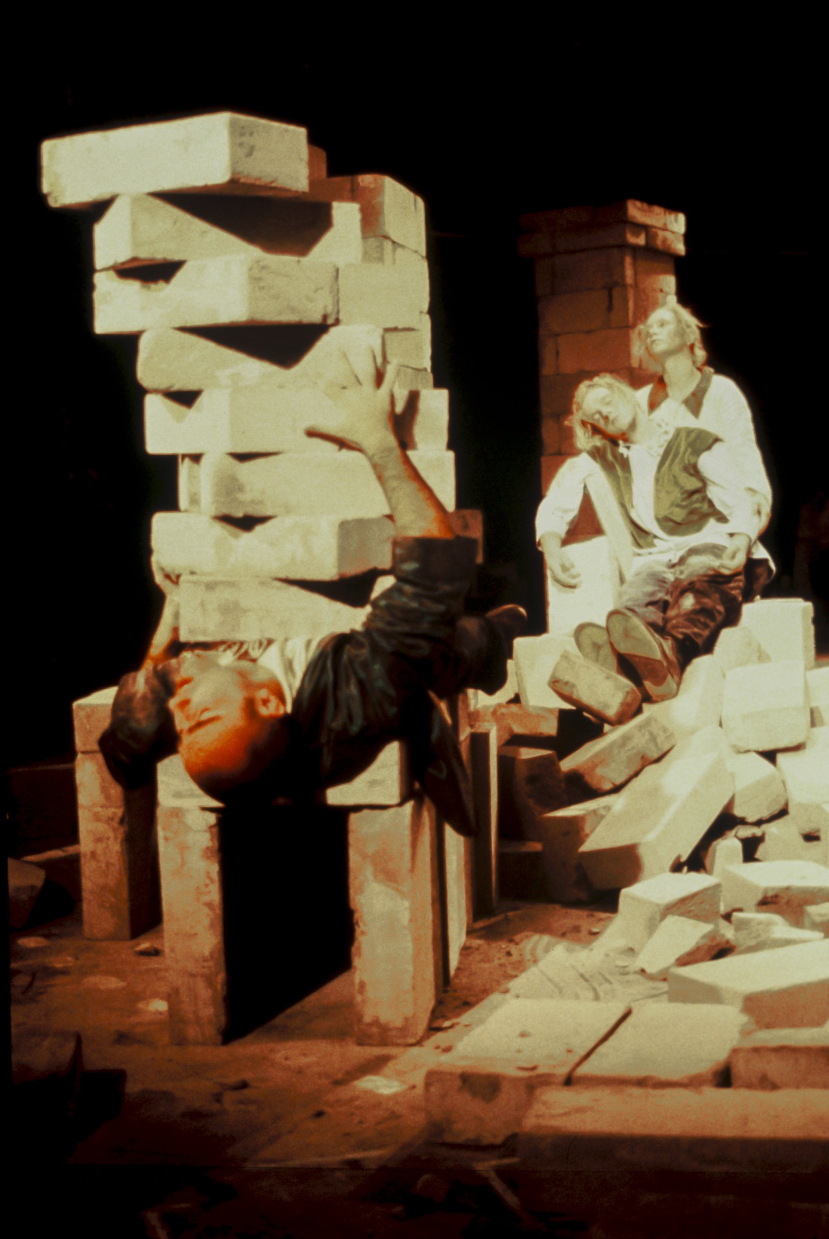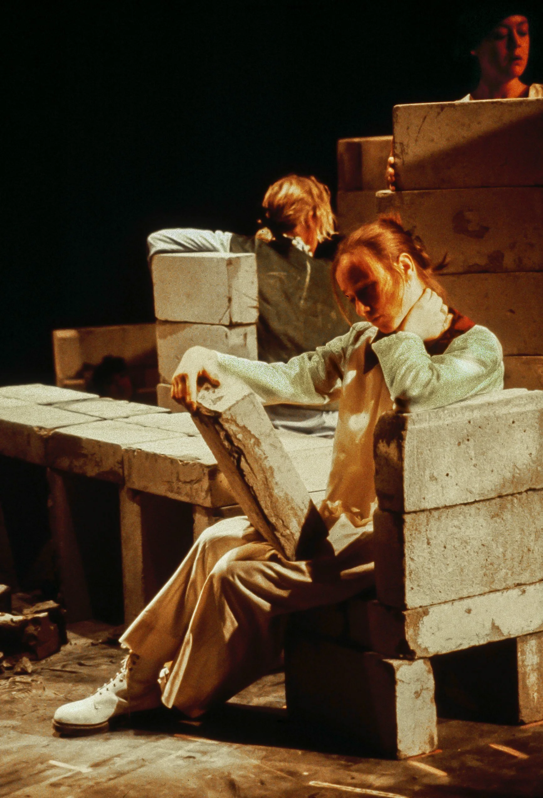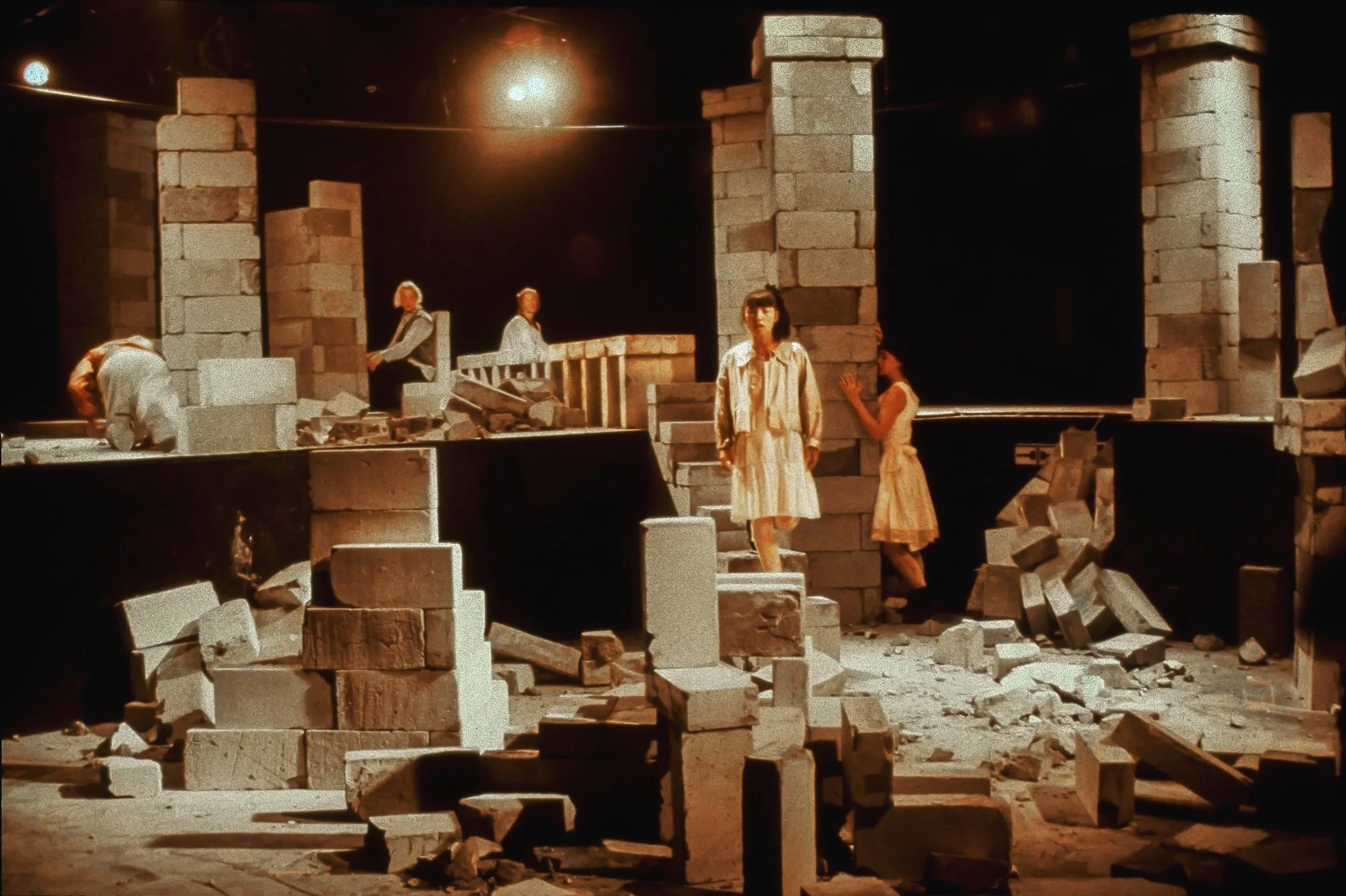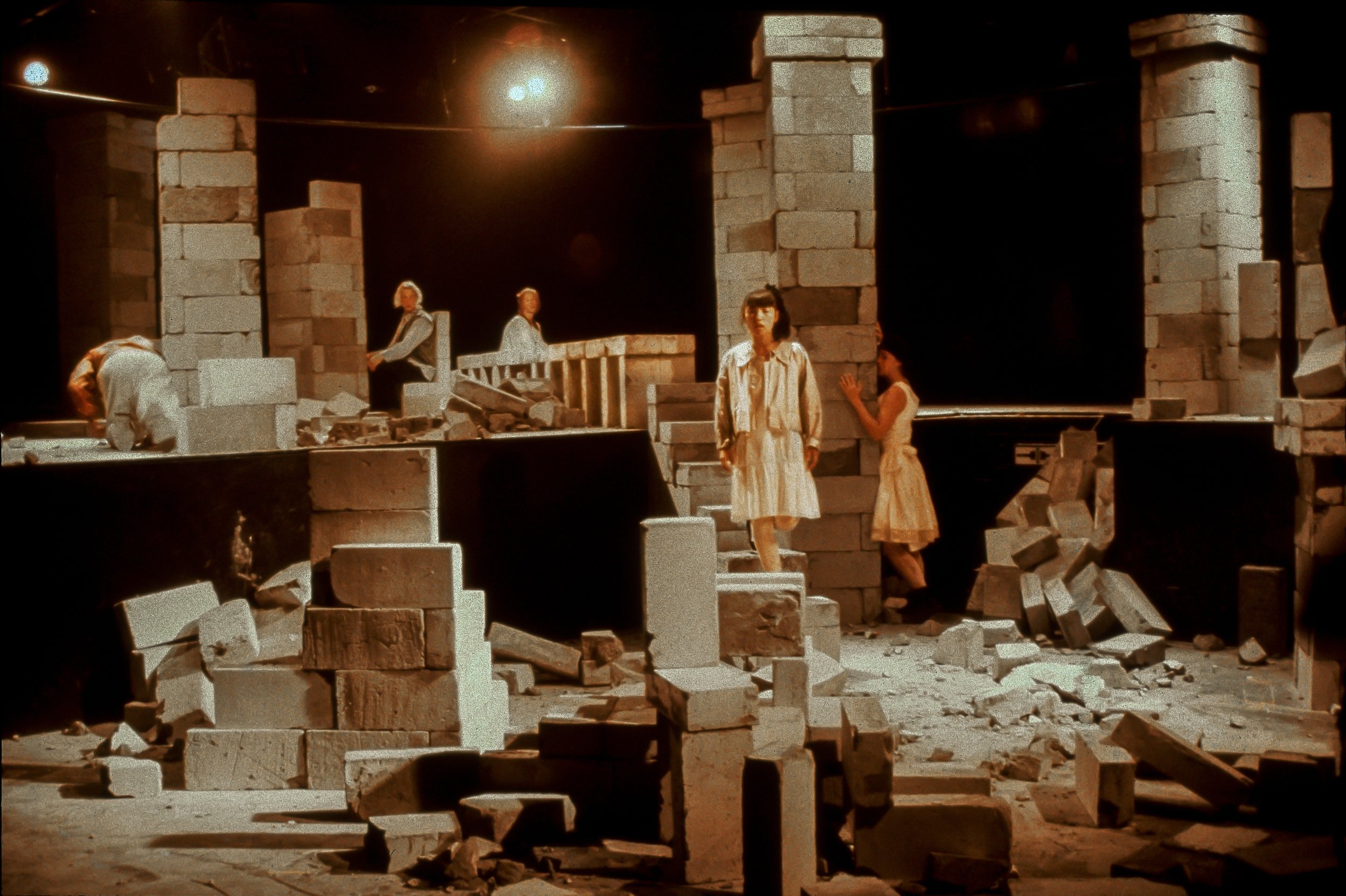 Set in the round in a disused car showroom, a dense, proliferating mass of towers and walls was inspired by the impenetrable nature of Tokyo’s urban fabric. The audience sat around the edges looking in, as the block structures slowly revolved as they transformed, revealing hitherto unseen vistas into the centre. Circling the space on an overhead rail, a video camera transmitted the hidden views to the audience seated on all four sides of the space.