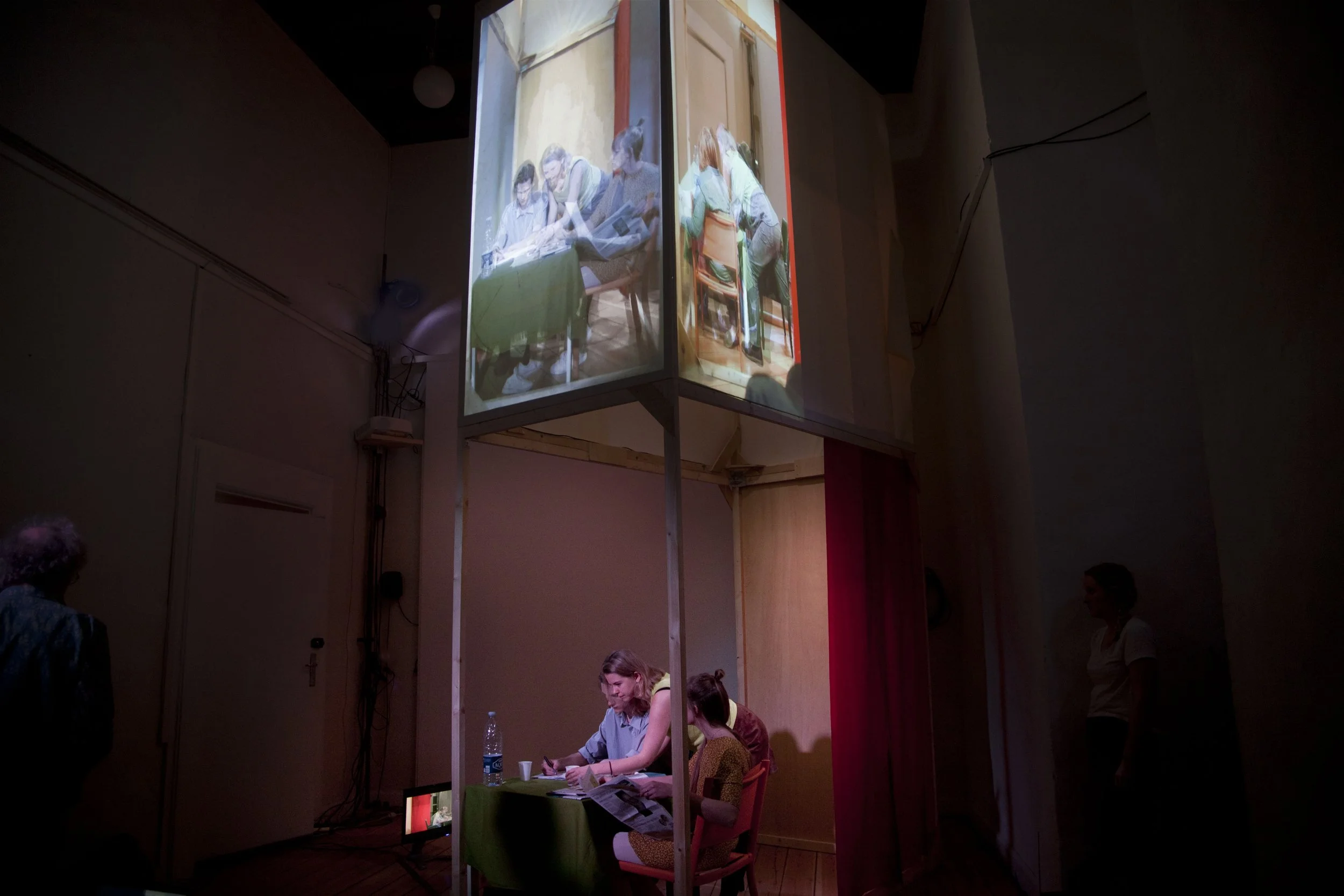 The frame of a room, the size of a small kitchen. One solid wall, the other three sides open. Each side is scanned by a camera and the result projected directly above. Walking around, the audience can see in from each side, as a projection above, as a real space below. Inside the room are three performers, their live images projected above, mixed with images from the recent past, the same three performers seen from three sides, occupying the space, at different times. The same kitchen is used daily for years. The room stays the same, but the people can change - coming from different times in the past, they interact with each other, haunting each other’s memories and premonitions.