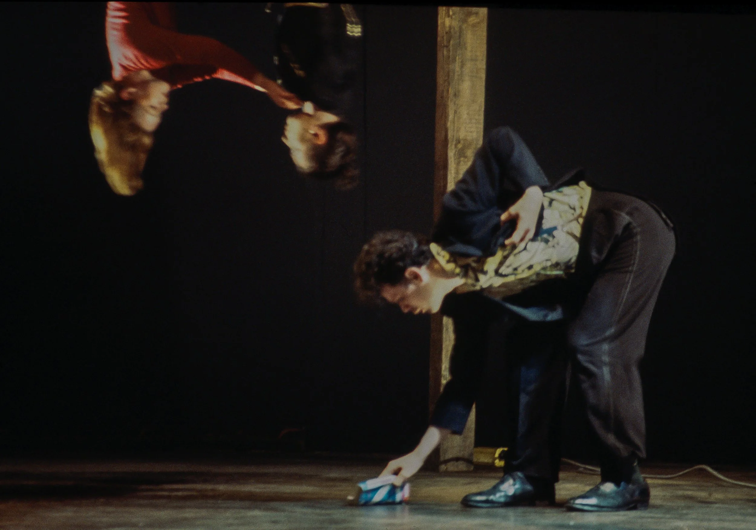 An inversion of the world. The performers were placed in a landscape which had been sliced up and jumbled in its transposition to the stage. They may be physically together yet dramatically separate, for they belonged to different parts of the landscape, and their sculptural choreography explored the possibilities of simultaneous, interleaved action. Sometimes parts of the landscape were rotated or inverted in respect to one another, so that the performers may be speaking and acting quite normally, but upside down. Occasionally one will make the disorienting move from one place to another, transforming, arriving out of the blue. For an entry to a house, a man at a table, upside down and ten feet off the ground, descended and rotated slowly through the air, both landing gently on the stage.