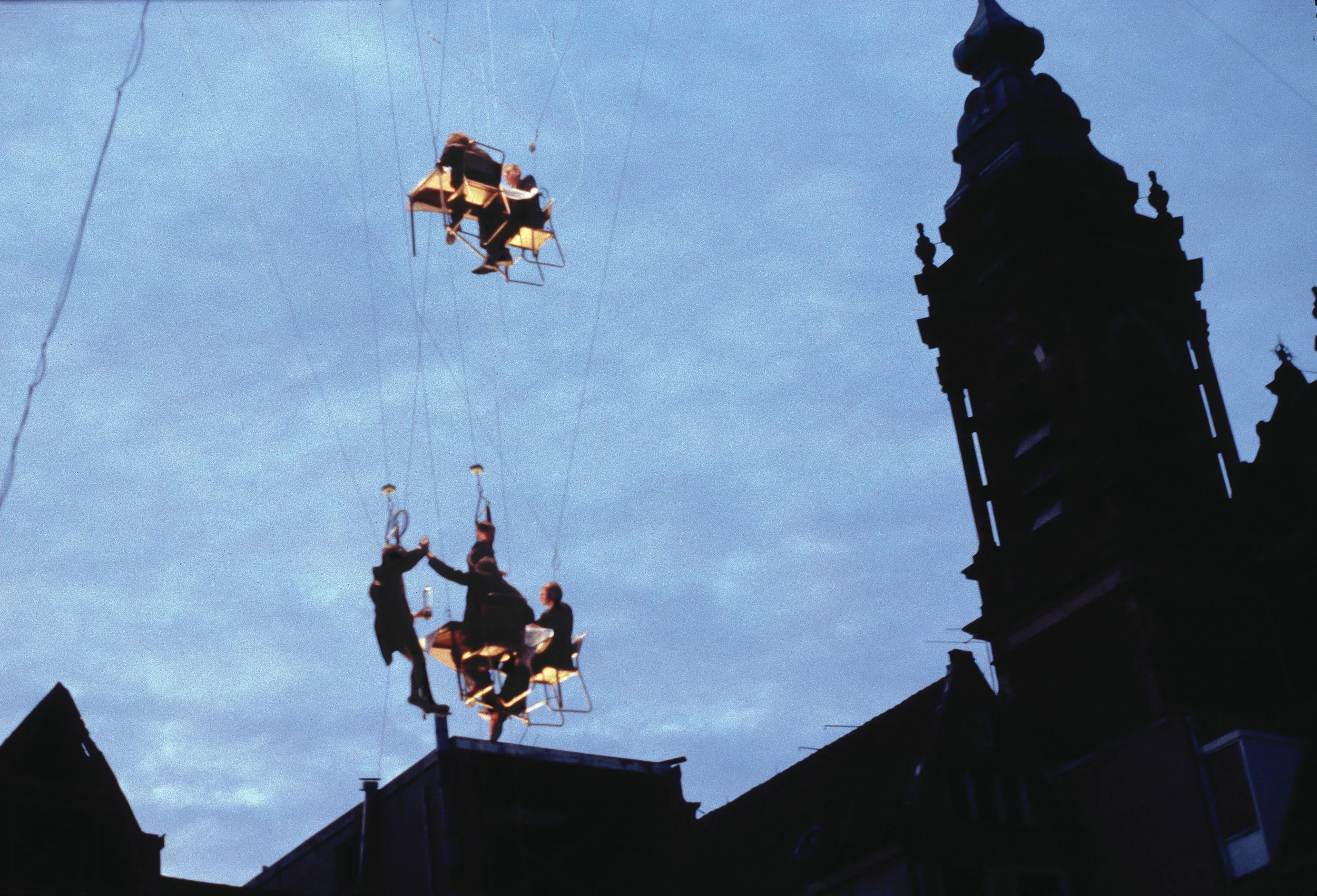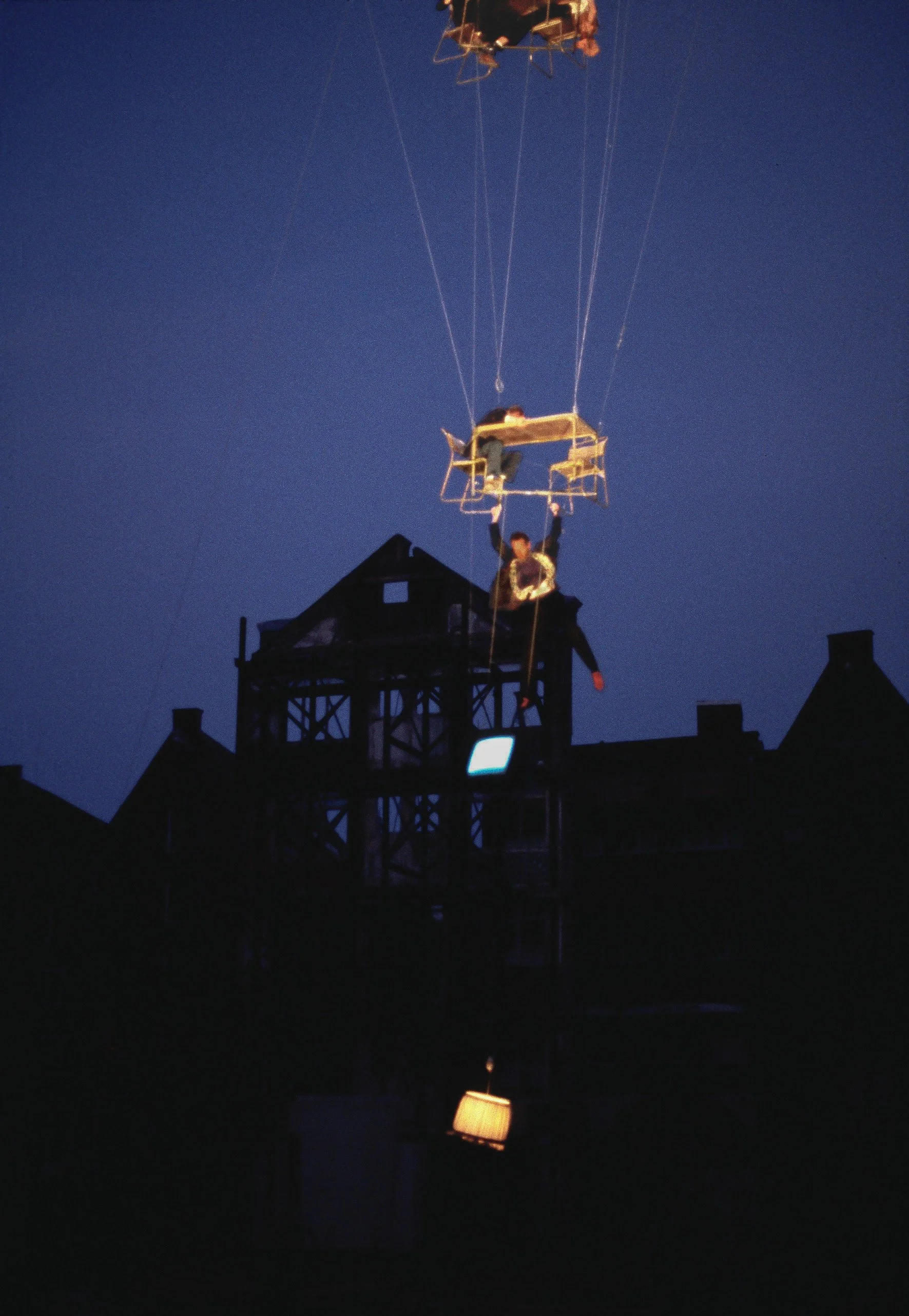 A city block has been demolished, leaving an empty space surrounded by the old facades. A column of flying tables occupies the space of the absent building as performers rise and fall between them, moving under their own weight. Eventually the whole column takes off and disappears into the sky.